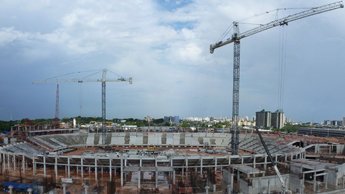 The Arena Amazonia stadium will host its first World Cup match on June 14. The 44,000-capacity arena is reportedly 80% complete and will be fitted with its grass pitch in October.