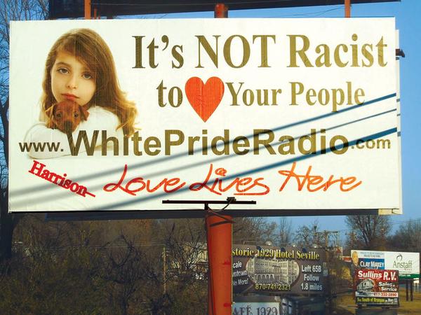 Placed on Highway 65 near Harrison’s city limits, the new billboard reads, “It’s NOT Racist to [heart] Your People.” It also describes Harrison by saying, “Love Lives Here,” and depicts a young white girl holding a puppy in her arms.