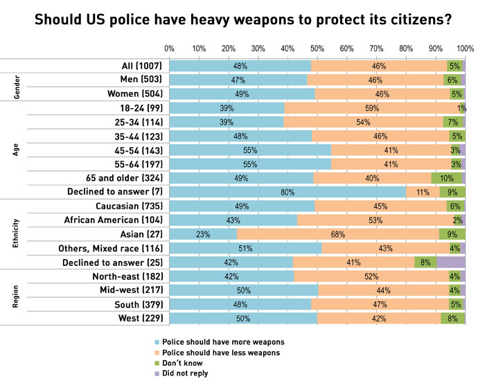 Its first question asked: “Do you agree or disagree with this statement: The American police should have military equipment and heavy weapons to protect its citizens?”
