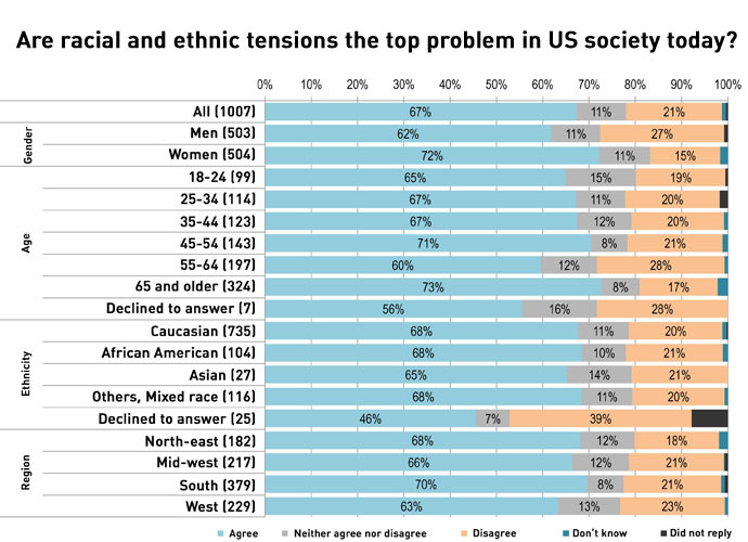 The second question of the survey probed whether racial tensions are one of the top problems in US society today. Almost 70 percent of respondents agreed.