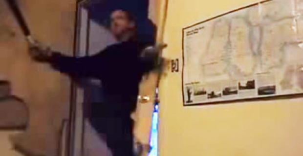 This is exactly the scenario James Cvengros was presented with recently when his insane neighbor Twain Thomas started screaming and becoming violent in the hallway of the apartment building in which Cvengros lives. Cvengros turned on a camera and pointed it at his front door just in case. As you’ll see in the video below, Thomas can be heard causing quite a ruckus outside, prompting Cvengros to take a look. He quickly closed and locked his door and waited.