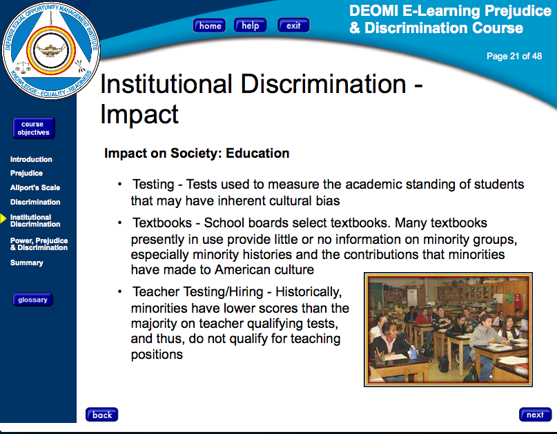 The DEOMI states more examples of institutional discrimination can be found in education: