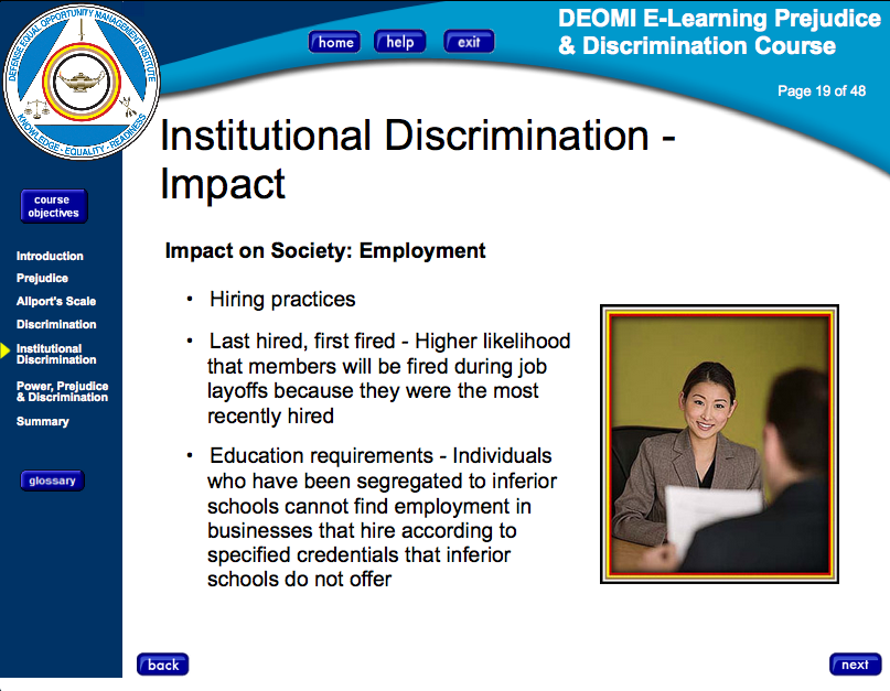 Institutional discrimination, according to the DEOMI course, can be found in employment, education, housing and the military.