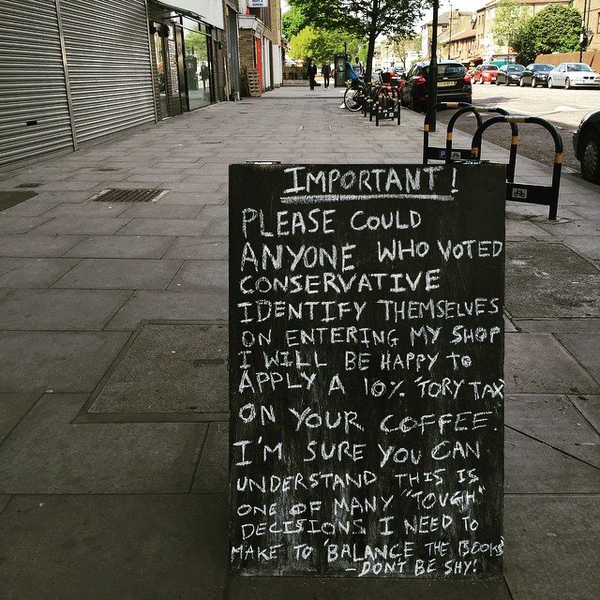The sign – see below – proposes a “Tory tax” of 10% on any customer who voted Conservative as one of the “‘tough’ decisions I need to make to ‘balance the books’ under your preferred government”. The sign also says UKIP voters should “shop elsewhere” – because they commit the terrible sin of disagreeing with a committed lefty.