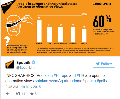 The only country among the five polled by the British company ICM Research for Sputnik news radio, in which less than half of respondents said they would like to have an alternative source of information on world affairs, was France. Forty-nine percent of the people there said they would be ‘quite interested’ or ‘interested a lot’ in it.