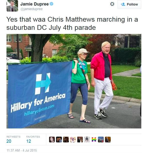 Jamie Dupree sent this fascinating tweet on Saturday, a picture of MSNBC Hardball host Chris Matthews marching in a suburban DC parade next to a Hillary Clinton for President banner.