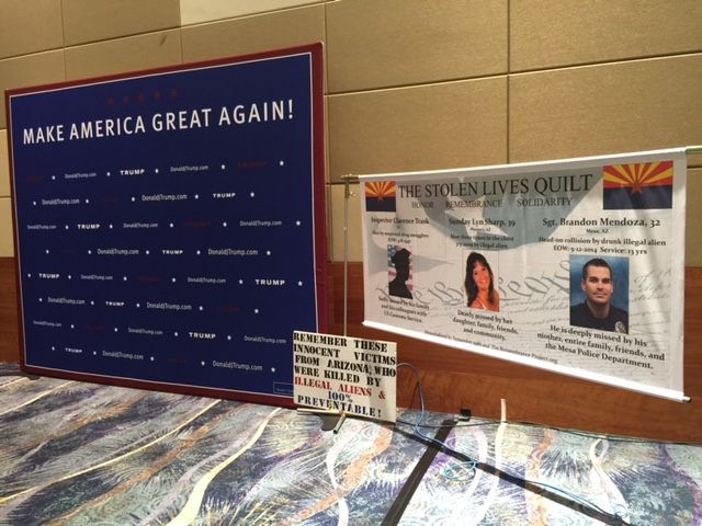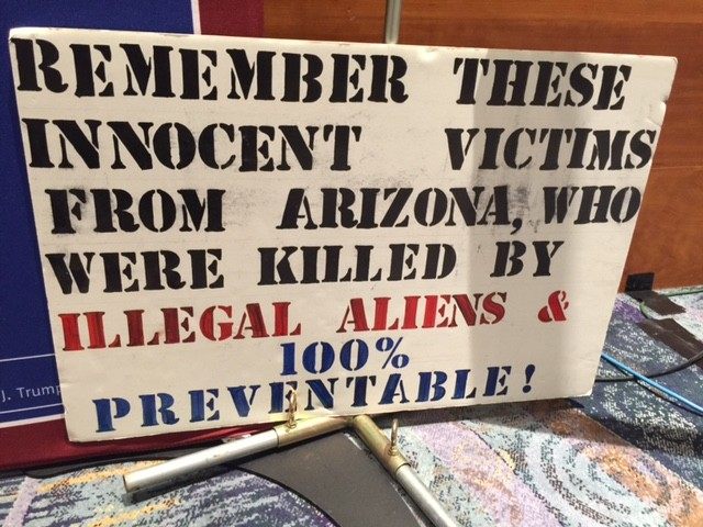 As security swept the event location, inside the hall some of Trump’s messaging is already in place: several signs discussed the illegal immigrant crime wave and the dead bodies left in its wake.