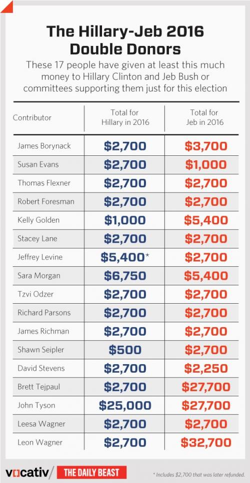 What many have tacitly known for a long time was finally confirmed overnight when an analysis of Federal Election Commission data by Vocativ and The Daily Beast found that of the 60 or so ultra-rich Americans – aka the mega-donors – who have contributed to both Jeb Bush’s and Hillary Clinton’s federal campaigns, seventeen of those contributors have gone one step further and opened their wallets to fund both Bush’s and Clinton’s 2016 ambitions.