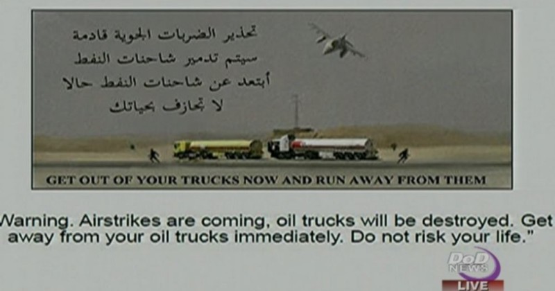 “Get out of your trucks now, and run away from them. Warning: air strikes are coming. Oil trucks will be destroyed. Get away from your oil trucks immediately. Do not risk your life,” the leaflet reads.