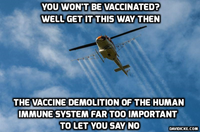 So, Americans, you refuse to get vaccinated by needle? Big Pharma’s “got your back.” They’re planning to spray some deadly viruses over your neighborhood, onto your organic garden and on your children’s heads. Got a vaccine exemption form filled out for personal, religious or medical reasons? No worries. The aerial assault is all inclusive – so it doesn’t matter if you’re allergic to anything.