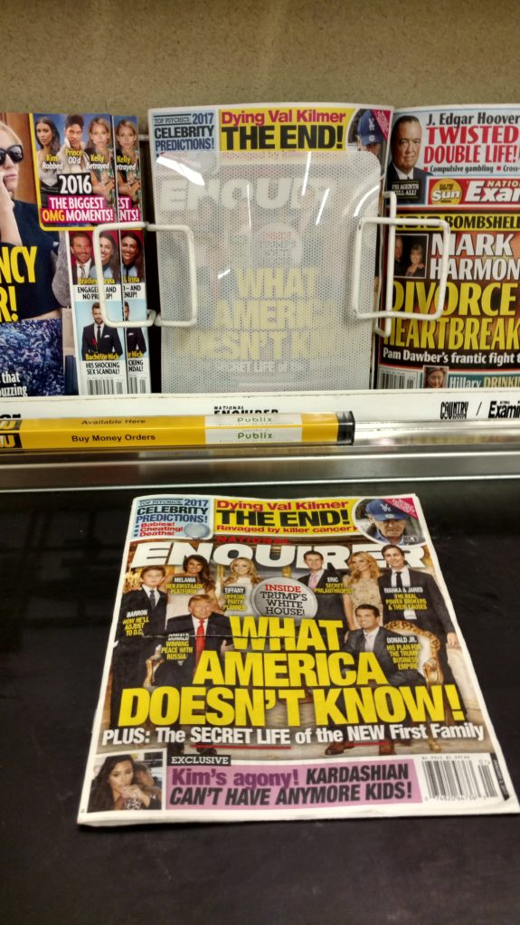 The National Enquirer has been sold at the checkout aisles of Publix for decades without being covered up until after Trump won the presidency on November 8 and was subsequently featured on the cover week after week.