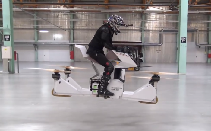 As if to answer my exact wish, on Feb 16, 2017 a crowdfunded, innovative company here in Moscow called “Hoversurf” unveiled and successfully flew a single-seat hoverbike, named the Scorpion-S. It seems this is a world first in successful one-man operator-controlled “fly-cycling”. Powered by both electricity and a hybrid battery, it can reach speeds up to 50 kilometers per hour with a flight time of 27 minutes. No doubt in time both will increase!