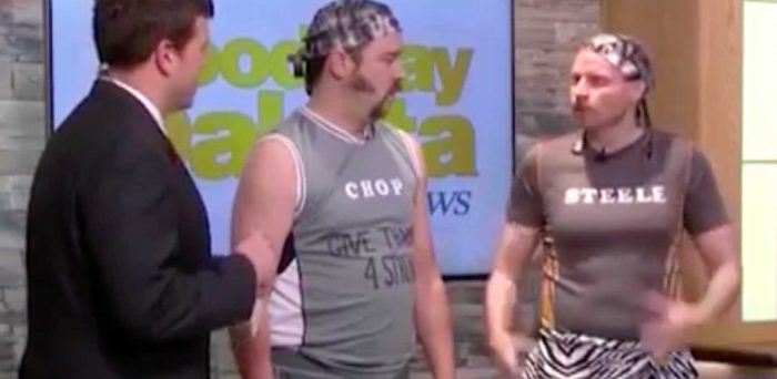 Joe Pickett and Nick Prueher appeared on WEAU-TV’s morning show Hello Wisconsin as “Chop and Steele,” a fake strongman duo whose stunts include karate chopping modestly-sized sticks, stomping on baskets, and whacking each other’s tennis rackets.