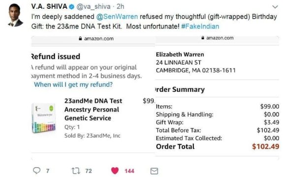 Last week V.A. Shiva sent Elizabeth Warren a 23&Me DNA kit for her birthday.