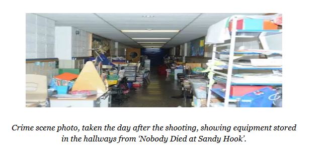 Crime scene photo, taken the day after the shooting, showing equipment stored in the hallways from ‘Nobody Died at Sandy Hook’.