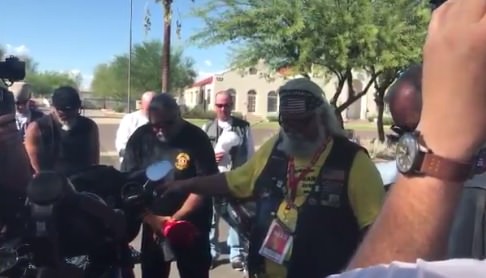 This is a touching moment. A group of Bikers for Trump members gathered before President Trump’s Phoenix rally to pray for the safety of all those who are attending the event. The biker leading the prayer asked that protesters didn’t turn violent and that attendees return to their families safe and sound after the rally.