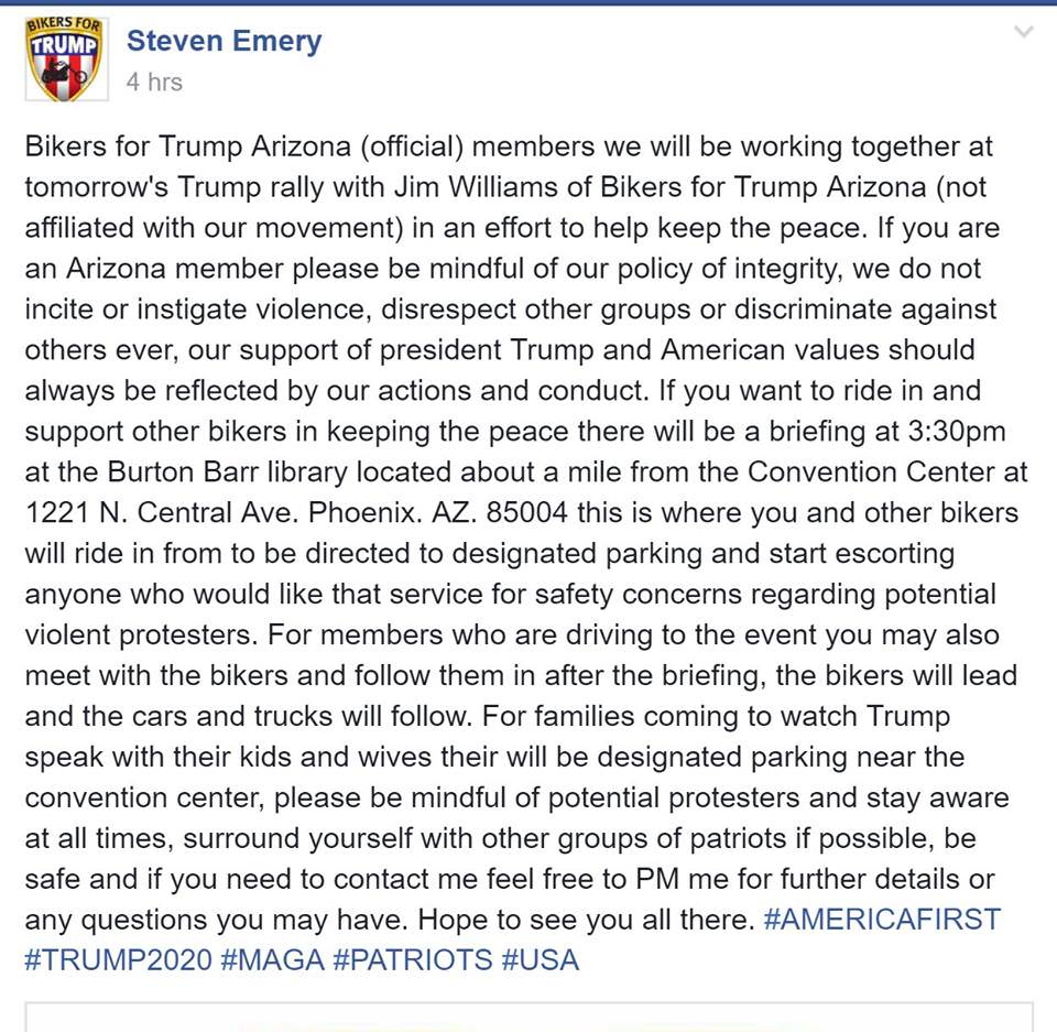 #BikersForTrump lay down the law at #PhoenixRally: “No one is going to be assaulted as long as we’re here.” pic.twitter.com/Go69wfoyXC