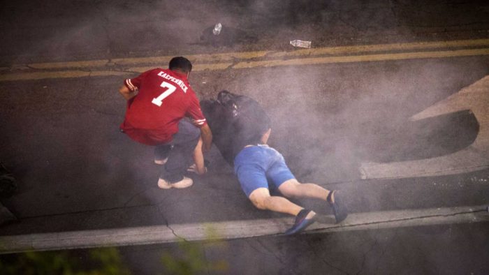 Of course, it’s perfect that the guy who comes to help the protester after he got hit in the beanbag is wearing a Colin Kaepernick jersey.