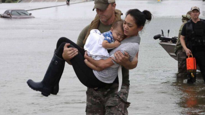 On Sunday, as images from Hurricane Harvey stunned the nation, one particular image stuck out for many Americans as indicative of the heroism of Texans in the face of disaster: a picture of a man in a baseball cap carefully carrying a woman through the water; the woman, in turn, holds close a baby curled up on her chest.
