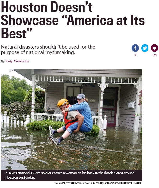 Liberal Slate writer Katy Waldman wants everyone to know the the viral images you’re seeing out of Houston do not showcase “America at its best.”