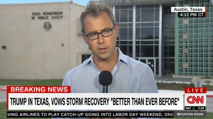 Zeleny, a senior White House correspondent for CNN, was mostly unfazed by the heckling, with only slight interruptions to his concentration and cadence. His spot ostensibly examined President Donald Trump’s response to Hurricane Harvey.