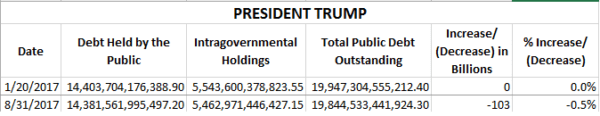 When President Trump was inaugurated on January 20, 2017 the amount of US Federal Debt owed both externally and internally was over $19 Trillion at $19,947,304,555,212. As of August 31st the amount of US Debt had decreased by more than $100 Billion to $19,844,533,441,924.