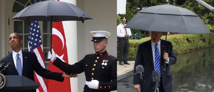 President Trump had his “umbrella moment” on Wednesday as he left the White House to board Marine One. You may notice a bit of a difference in how the two men handled it.