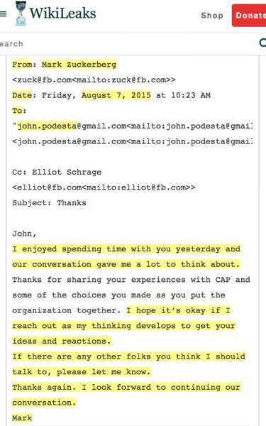 Mark Zuckerberg also emailed John Podesta on August 7, 2015 “I enjoyed spending time with you yesterday…I look forward to continuing our conversation” (screenshot below) or you can read the full email here.