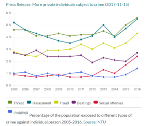 Fully 15.6 per cent of the population aged 16-79 were subjected to abuse, threats, sexual offences, personal property, fraud, or harassment in 2016, based on a sample of 12,000 people.