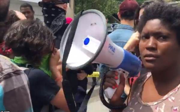 One protester, who was also caught on camera attacking another reporter for her appearance, screamed into a megaphone in the reporters face while attempting to block her from filming. As the verbal assault took place, another protester shoved her from behind.