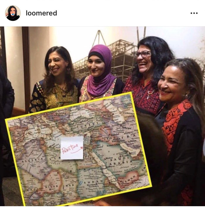 Not only were these two women sworn in on Thomas Jefferson’s Quran today, but Ilhan wore a hijab and Rashida invited known Jew haters Linda Sarsour and Rasha Mubarak as her guests. The women later posed for a picture with a map of the Middle East in which they crossed out Israel and replaced the Jewish state with a sticky note that said “Palestine”.