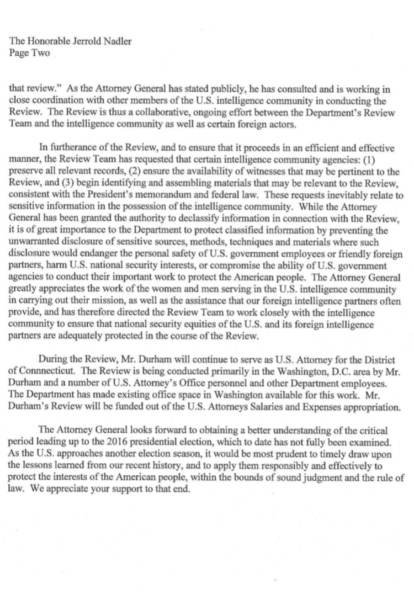 A new letter from the Justice Department addressed to Rep. Jerrold Nadler (D-NY) reveals John Durham’s investigation into Spygate is much larger than previously known.