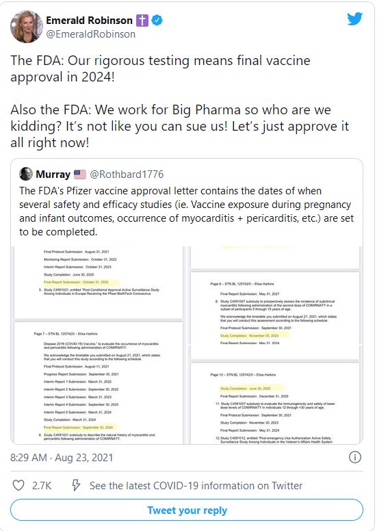 FDA Approval Letter for Pfizer Vaccine Had Several Key Future Dates to Complete Studies Then Threw Them All In the Garbage and Approved It Yesterday