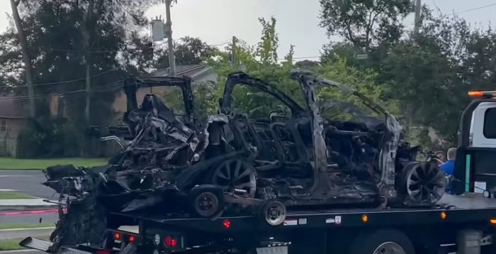 “Hurricane flooded Tesla Bursts into flames while being towed to the storage lot. Driver picked up the flood damaged Tesla from a storm damaged home and was towing it back when it burst into flames. Driver stopped on a street and quickly off loaded the burning car to save his truck. (that’s why there are burnt tow dollies under it). When the fire department arrived, they put it out, but it kept reigniting. After several attempts to put it out, they just let it burn out. This was all that was left,” McLynas wrote in his post on YouTube.