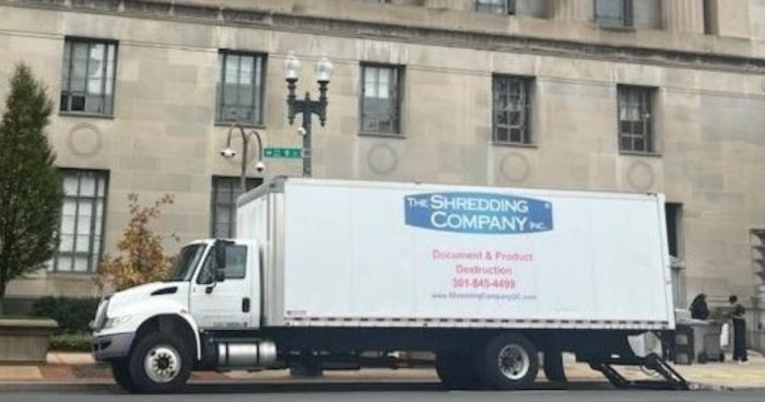 On Tuesday, the House Oversight Committee’s X account obtained footage of a truck from a paper-shredding company stationed outside the DOJ.