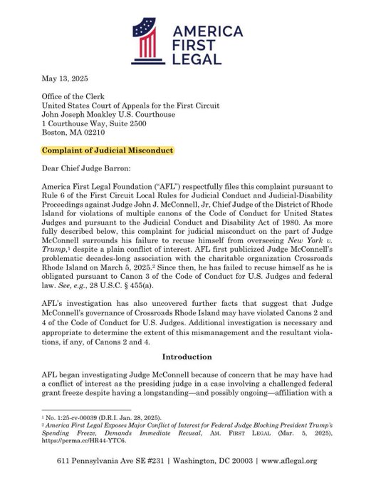 In March, congressional Republicans formally called for the impeachment of Rhode Island Federal Judge John McConnell Jr. This week, America First Legal (AFL) filed a judicial complaint against him, asking Chief Judge David Barron of the U.S. Court of Appeals for the First Circuit to investigate McConnell.