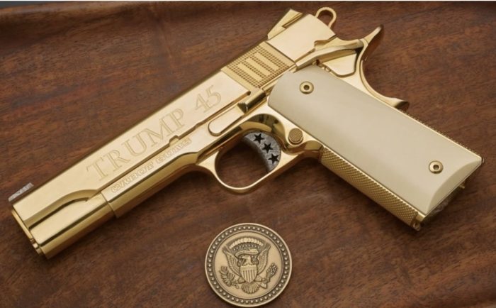 The Trump 45 is unlike collectable handgun ever produced. This made in America gun by Cabot Guns is a 24k gold finish with grips crafted from American holly. The trigger and front sight are hand crafted from Gibeon Meteorite