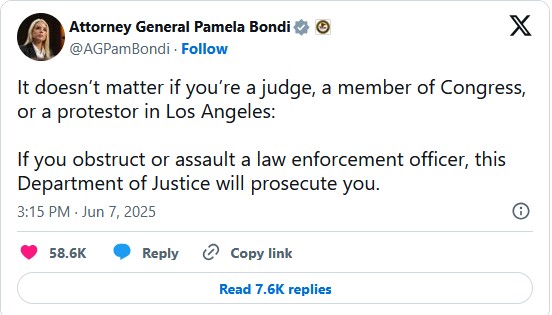 In the midst of chaos and anarchy in Los Angeles, AG Bondi just told the entire state that it doesn’t matter who you are, if you obstruct or assault a law enforcement officer, you’re going to prison: