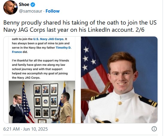 The officer, identified as Benjamin “Benny” France, proudly posted about his entry into the prestigious Navy Judge Advocate General’s Corps just last year — but his recent unhinged behavior on X (formerly Twitter) is now raising serious questions about the ideological rot festering inside the Pentagon.