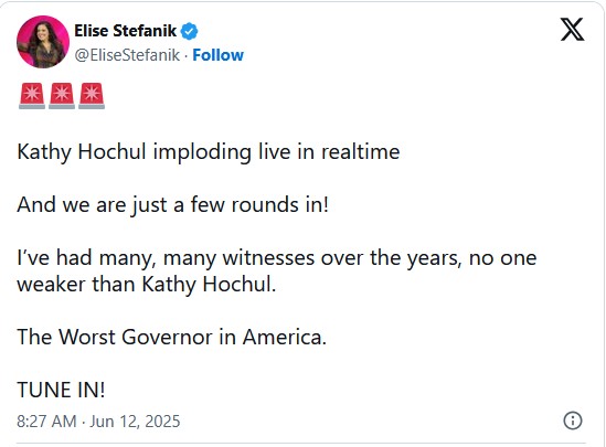 The questioning was led by Rep. Elise Stefanik (R-NY), who pressed Hochul to account for the consequences of New York’s sanctuary state policies.
