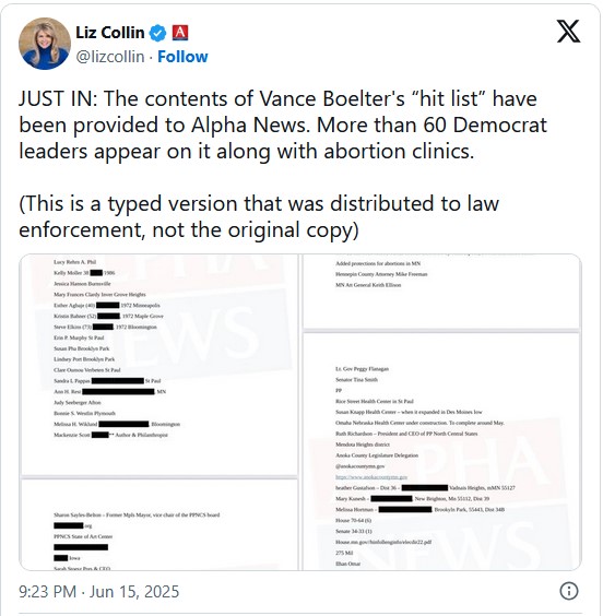 The story now gets weird. Liz Collin of Alpha News announced that she had acquired Vance Boelter’s “hit list.” As she notes, more than 60 Democrat leaders appear on it, along with some abortion clinics.