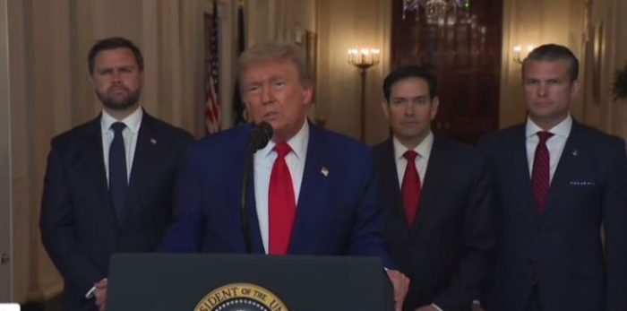 President Trump addressed the nation at 10 PM Eastern following the attacks. Vice President J.D. Vance, Secretary of State Marco Rubio, Secretary of Defense Pete Hegseth, joined Trump at the White House during his three-minute address.