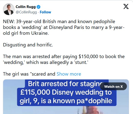 Multiple arrests have been made at an event at Disneyland Paris which, media reports have confirmed, featured an alleged pedophile reportedly trying to “marry” a 9-year-old girl who was dressed in a wedding dress and had high heels taped to her feet.