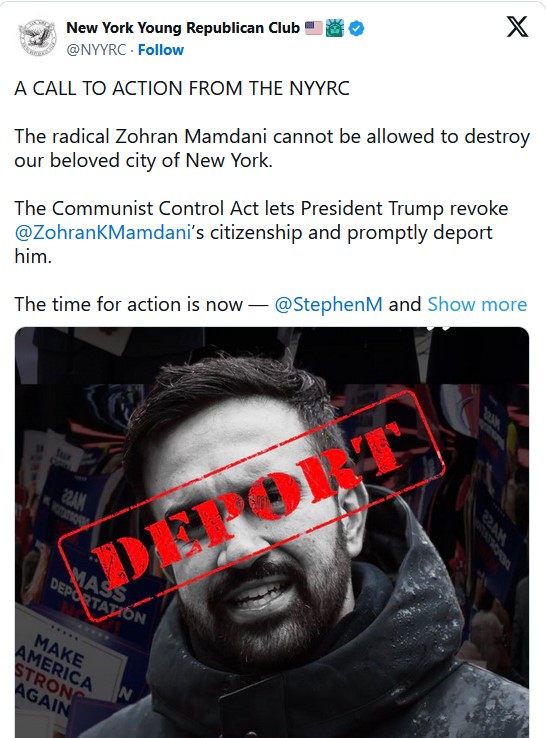 The New York Young Republican Club has urged President Donald Trump to revoke the U.S. citizenship of New York City Democratic mayoral candidate Zohran Mamdani and deport him under the Communist Control Act of 1954, which bans communists from holding certain political offices.