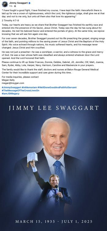 “I have fought a good fight, I have finished my course, I have kept the faith: Henceforth there is laid up for me a crown of righteousness, which the Lord, the righteous judge, shall give me at that day: and not to me only, but unto all them also that love his appearing.”2 Timothy 4:7-8Today, our hearts are heavy as we share that Brother Swaggart has finished his earthly race and entered into the presence of His Savior, Jesus Christ. Today was the day he has sung about for decades. He met his beloved Savior and entered the portals of glory. At the same time, we rejoice knowing that we will see him again one day.For over seven decades, Brother Swaggart poured out his life preaching the gospel, singing songs of the faith, and pointing millions to the saving power of Jesus Christ and the Baptism of the Holy Spirit. His voice echoed through nations, his music softened hearts, and his message never changed: Jesus Christ and Him crucified.He was not just a preacher—he was a worshiper, a warrior, and a witness to the grace and mercy of God. He was a man whose faith was steadfast and always entered whatever door the Lord opened. And the Lord honored that faith.Please continue to lift up Sister Frances, Donnie, Debbie, Gabriel, Jill, Jennifer, Clif, Matt, Joanna, Sam, Ryder, Abby, Lola, Harper, Navy, Harrison, Caroline and Mackenzie in your prayers.The family would like to thank the staff, doctors and nurses at Baton Rouge General Medical Center for their incredible support and care given during this time.