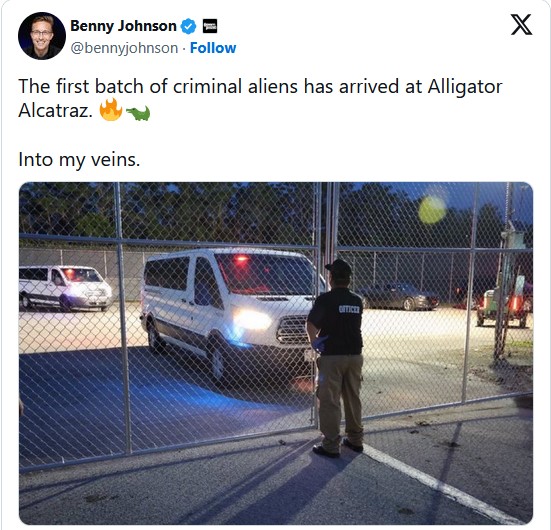“The first group has arrived at Alligator Alcatraz. Stood up in record time under @GovRonDeSantis’ leadership & in coordination with @DHSgov & @ICEgov, Florida is proud to help facilitate @realDonaldTrump’s mission to enforce immigration law,” the Florida Division of Emergency Management wrote on X.