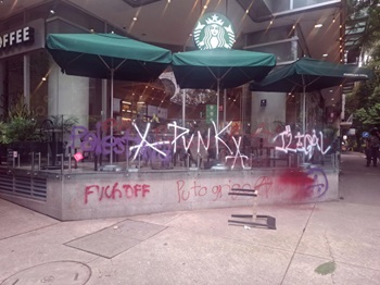 Rioters also assaulted various individuals who tried to interfere and spray-painted walls; they also destroyed city signs and structures.