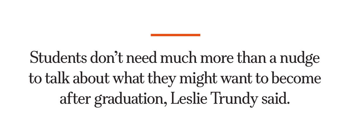 Students do not need much more than a nudge to talk about what they might want to become after graduation, she said, and they are willing to listen to suggestions on what they can do to get there.