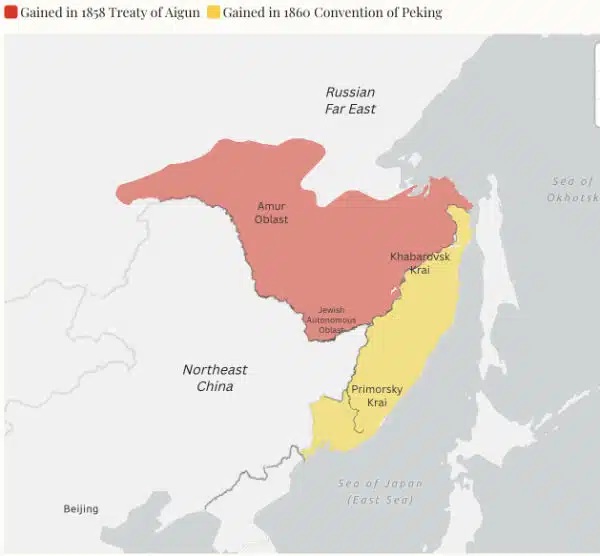 Chinese territory was ceded to Russia in 1858 and 1860.