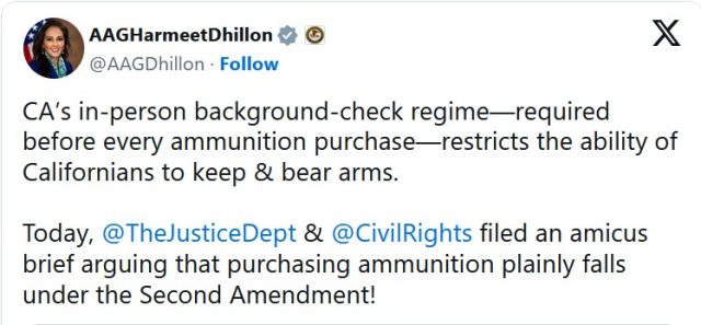 Harmeet Dhillon, Assistant Attorney General for Civil Rights at the DOJ, announced the brief via X, making clear the DOJ’s position that California’s background check requirement re: ammo purchases “restricts the ability of Californians to keep and bear arms.”